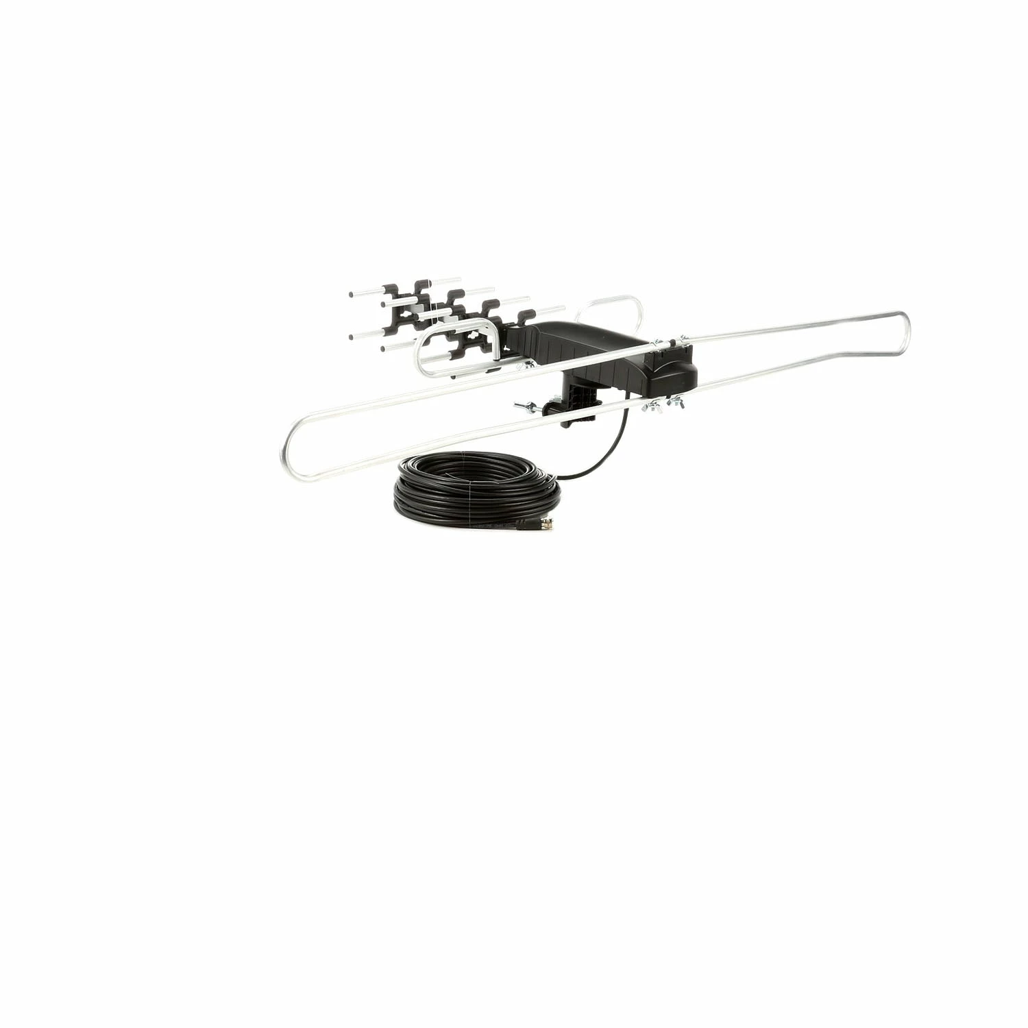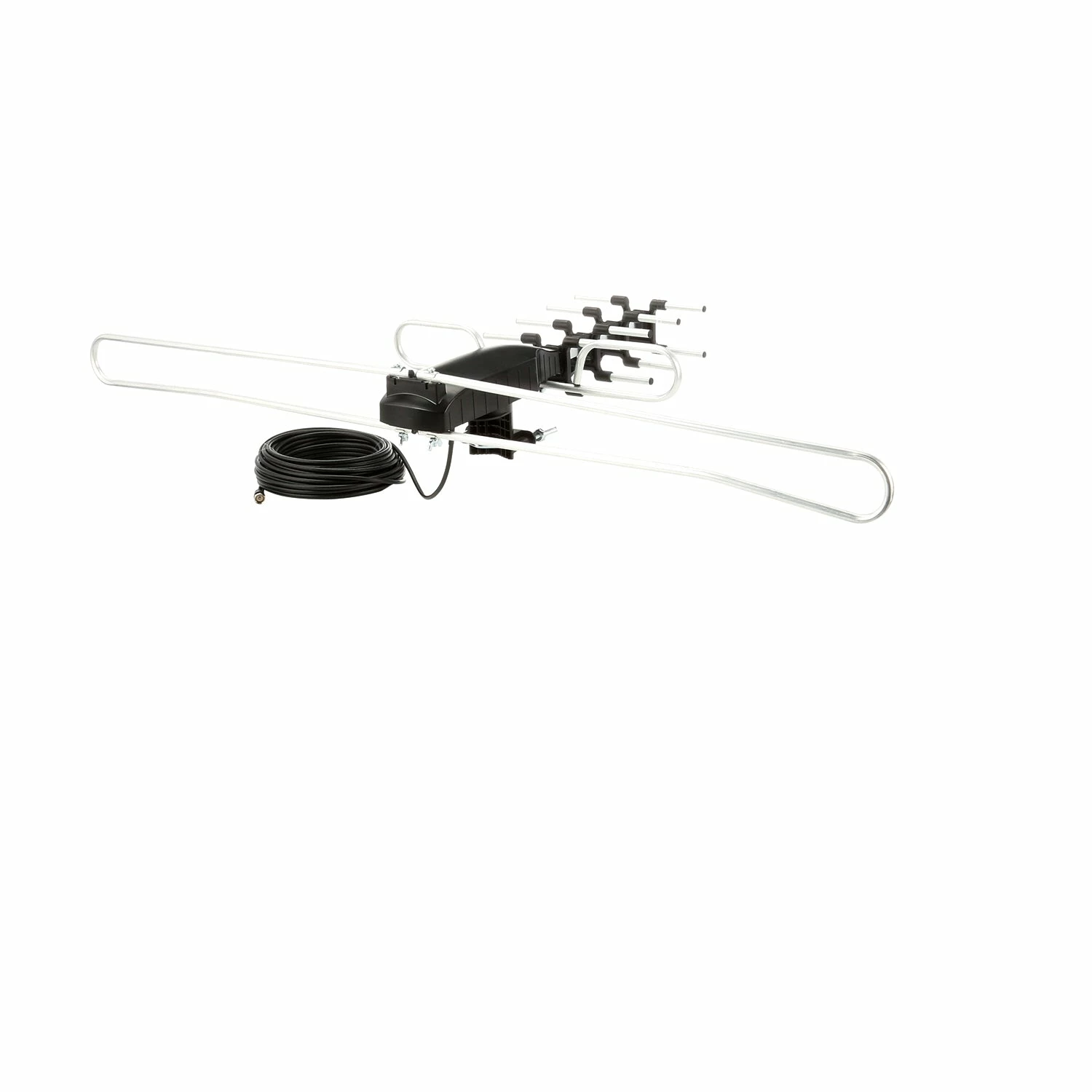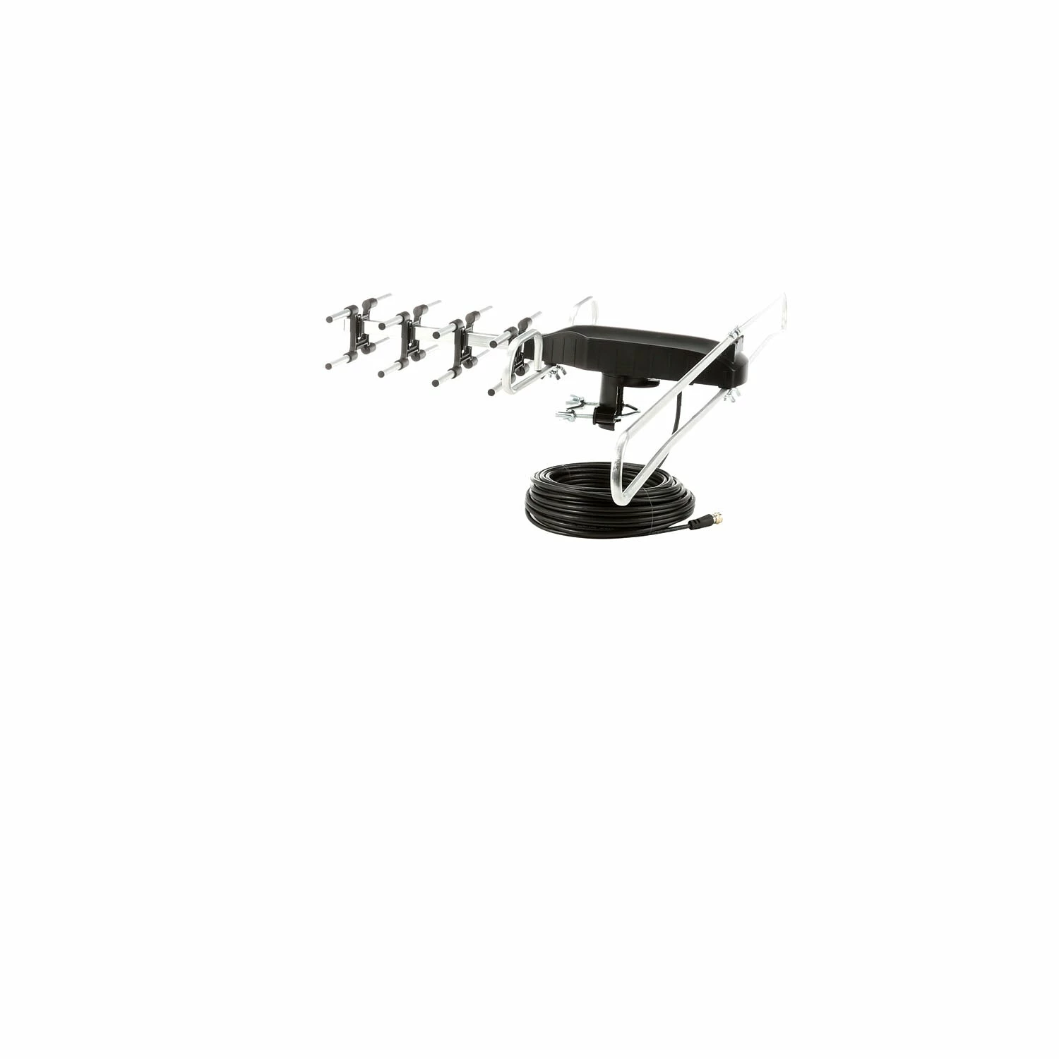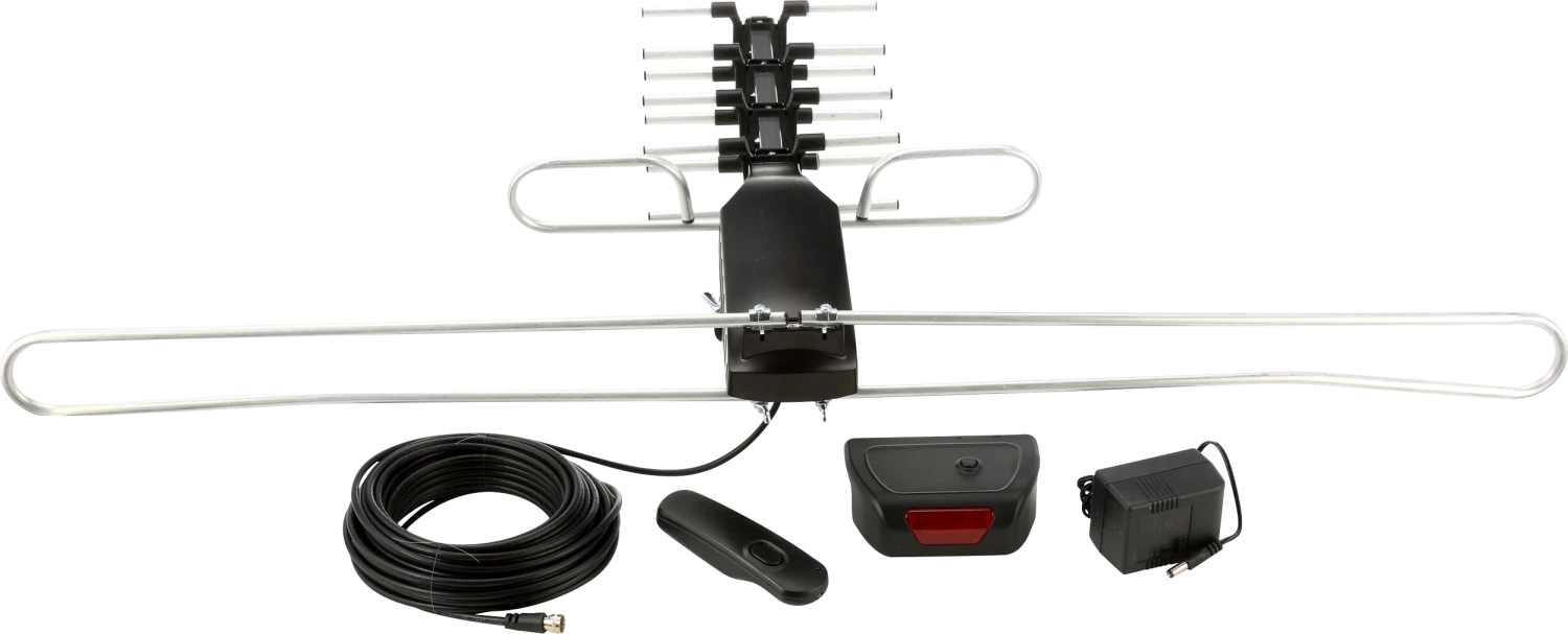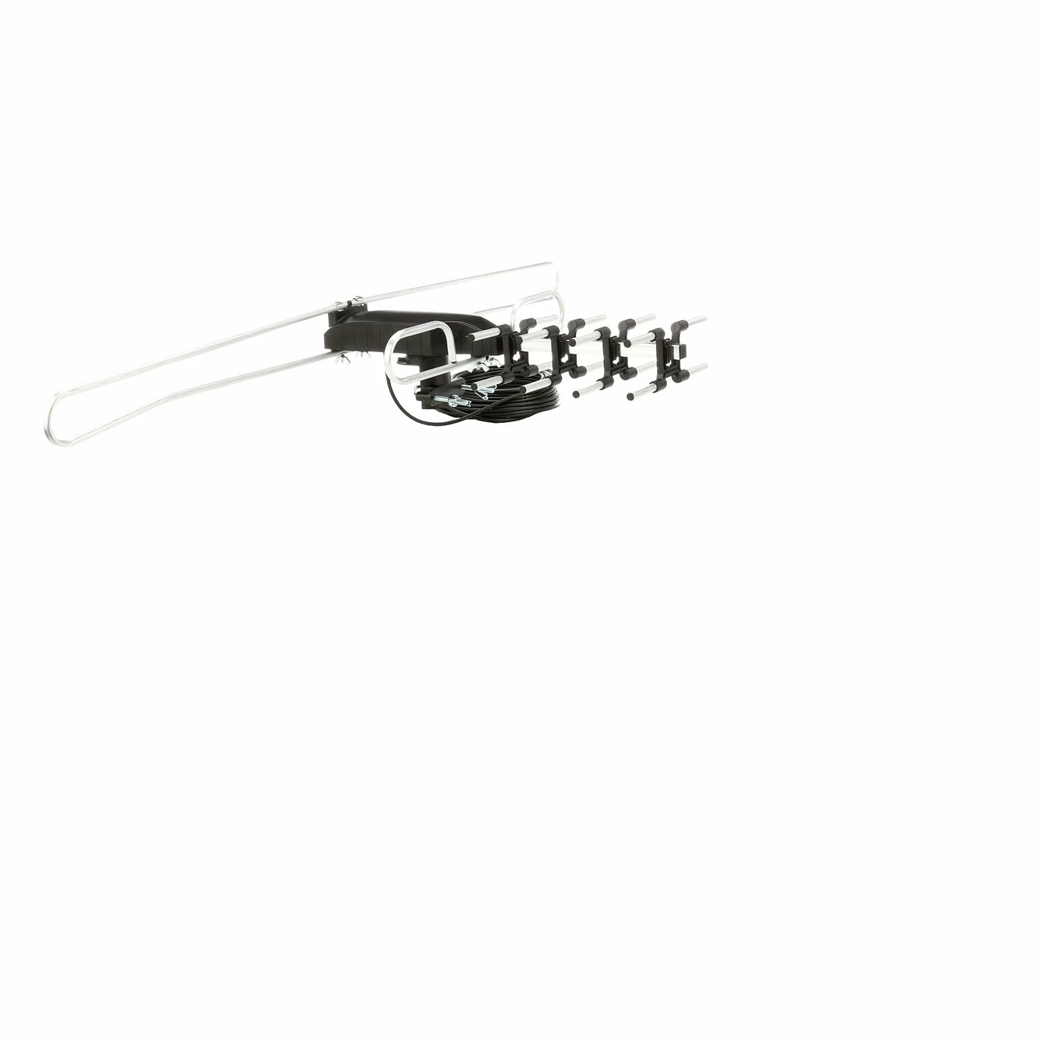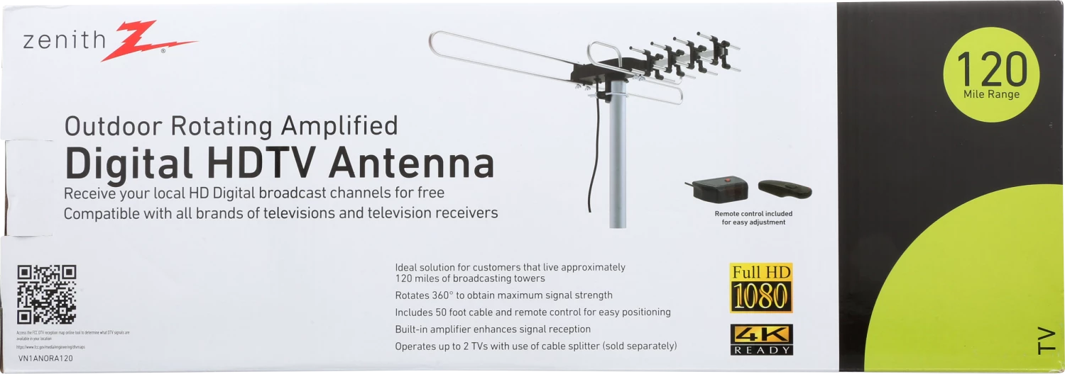 The Zenith 360ยฐ rotating outdoor passive antenna with Remote Control provides high gain with a wide band amplifier that boosts signal strength for increased picture and sound quality.ย Receives UHF, VHF and FM HD digital channels within a range of 120 miles and works with HD or analog TVs. The weather resistant anodized aluminum elements ensure durability and function in all different weather conditions. It is fully ready for use with digital TV and HDTV. This antenna is a full band DTV/VHF/UHF receiver. A wireless remote control allows for easy use, and the simple bracket makes installation hassle free. The installation kit includes a 50ft coaxial cable.