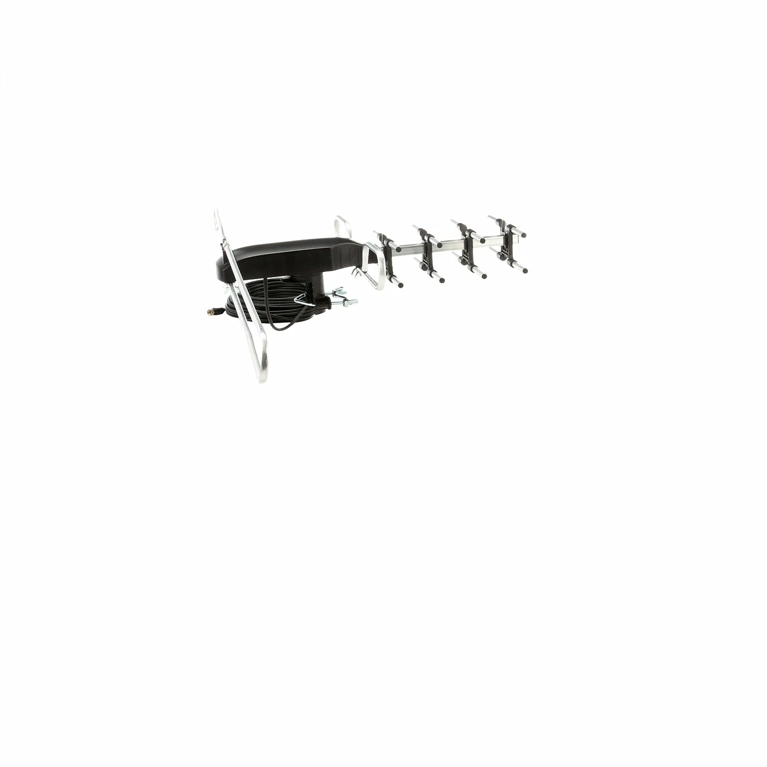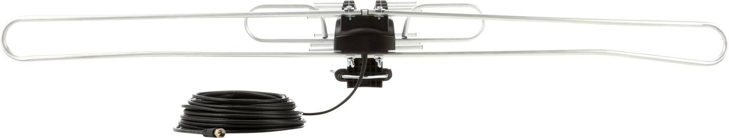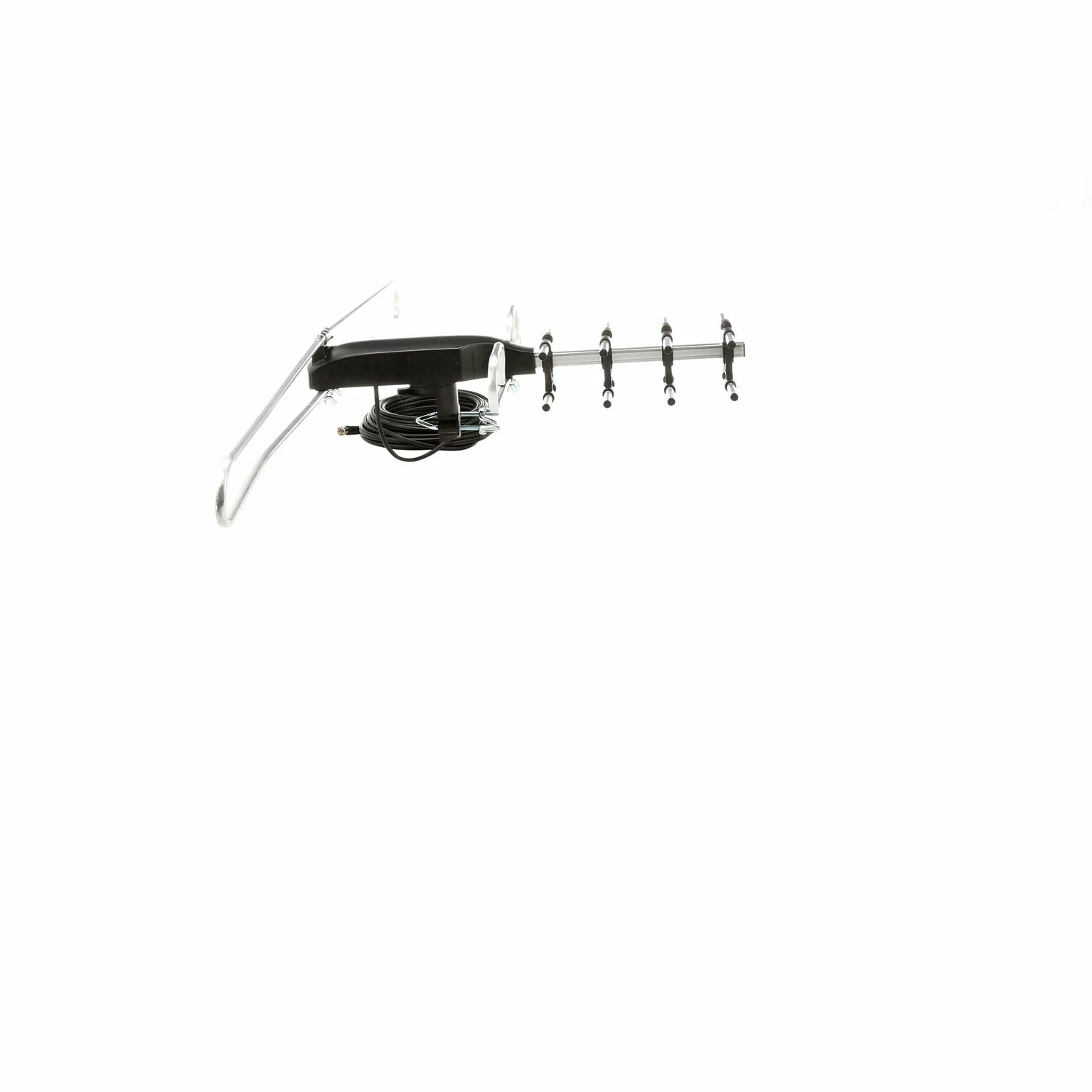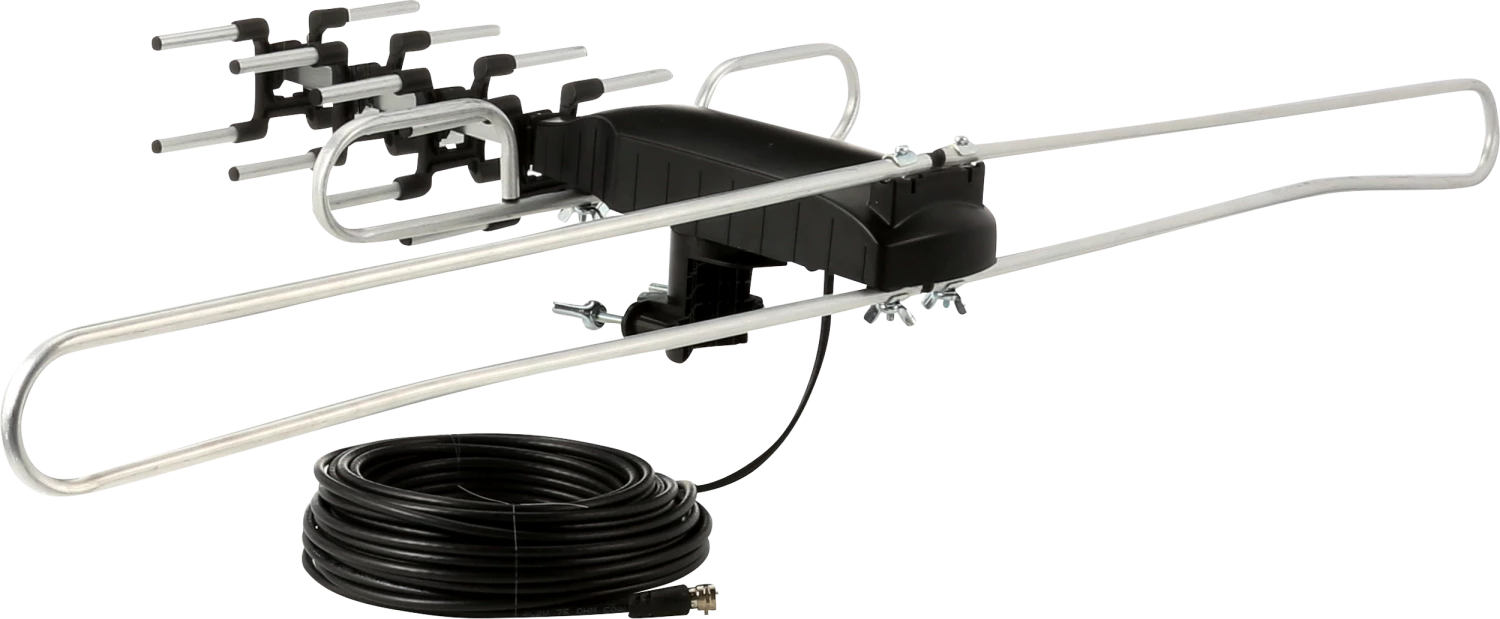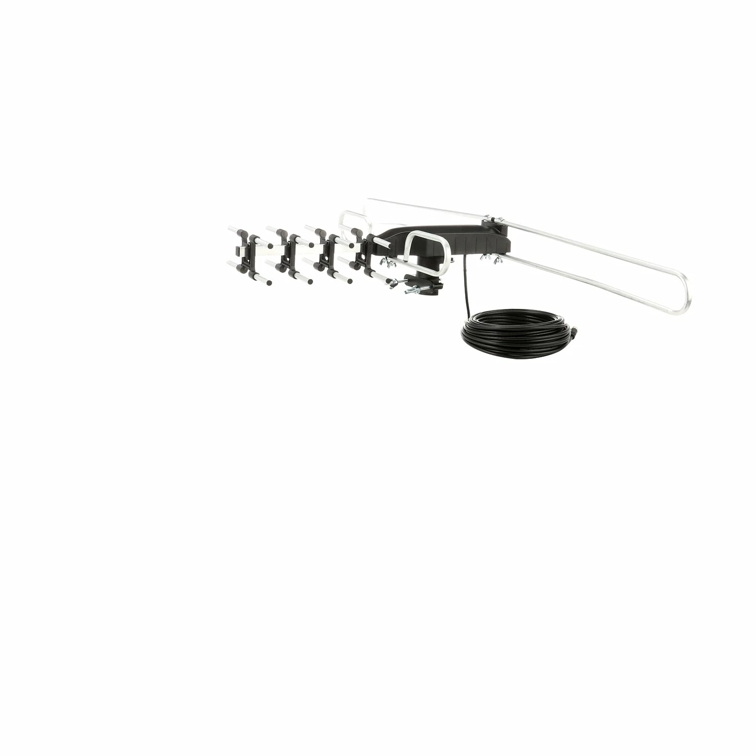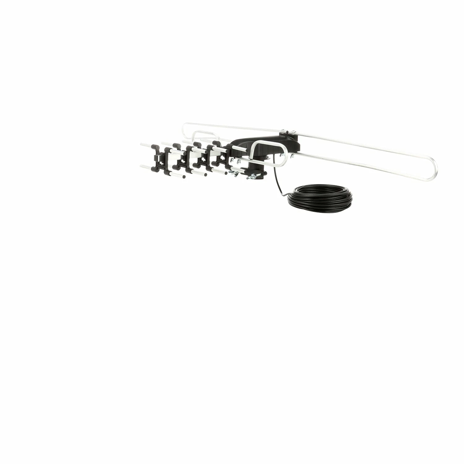 The Zenith 360ยฐ rotating outdoor passive antenna with Remote Control provides high gain with a wide band amplifier that boosts signal strength for increased picture and sound quality.ย Receives UHF, VHF and FM HD digital channels within a range of 120 miles and works with HD or analog TVs. The weather resistant anodized aluminum elements ensure durability and function in all different weather conditions. It is fully ready for use with digital TV and HDTV. This antenna is a full band DTV/VHF/UHF receiver. A wireless remote control allows for easy use, and the simple bracket makes installation hassle free. The installation kit includes a 50ft coaxial cable.