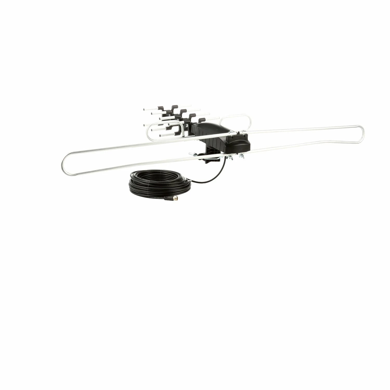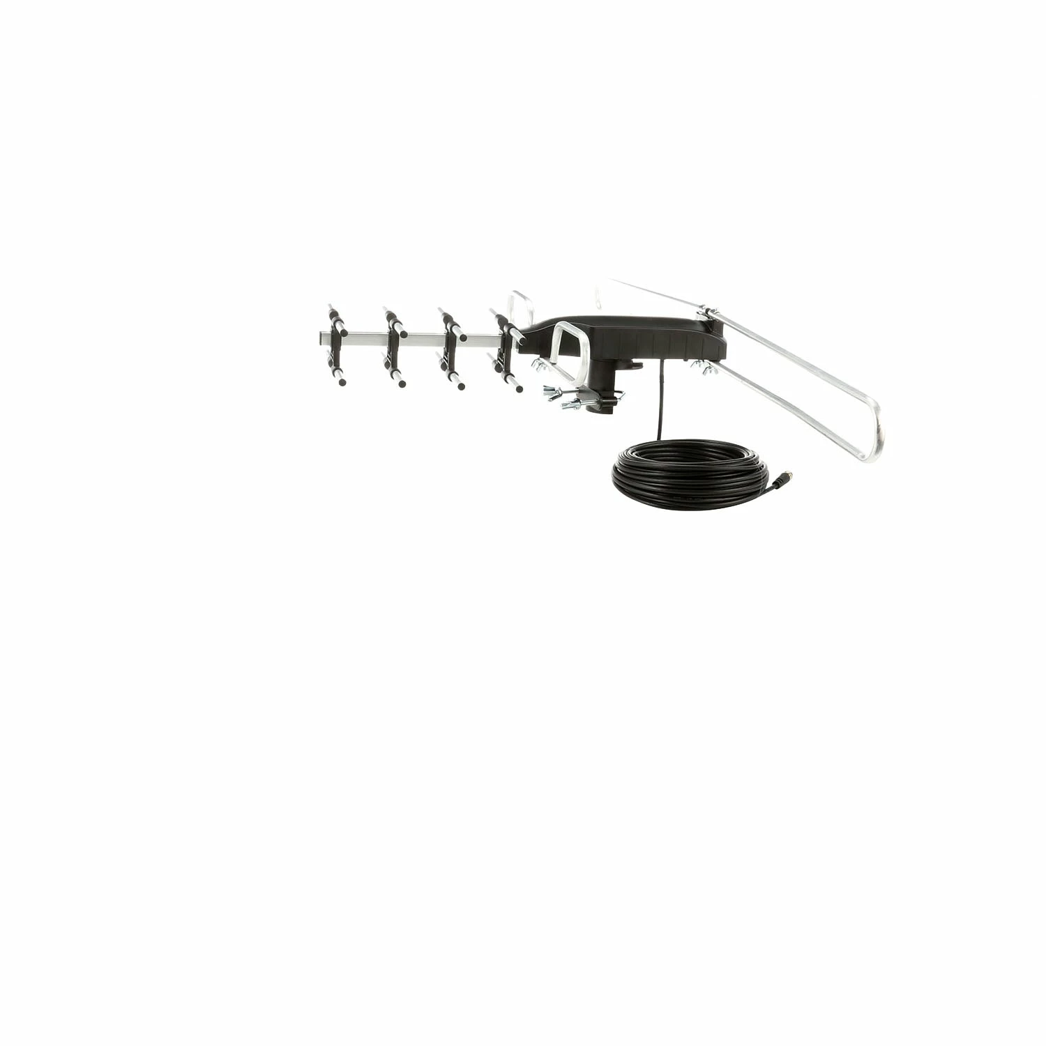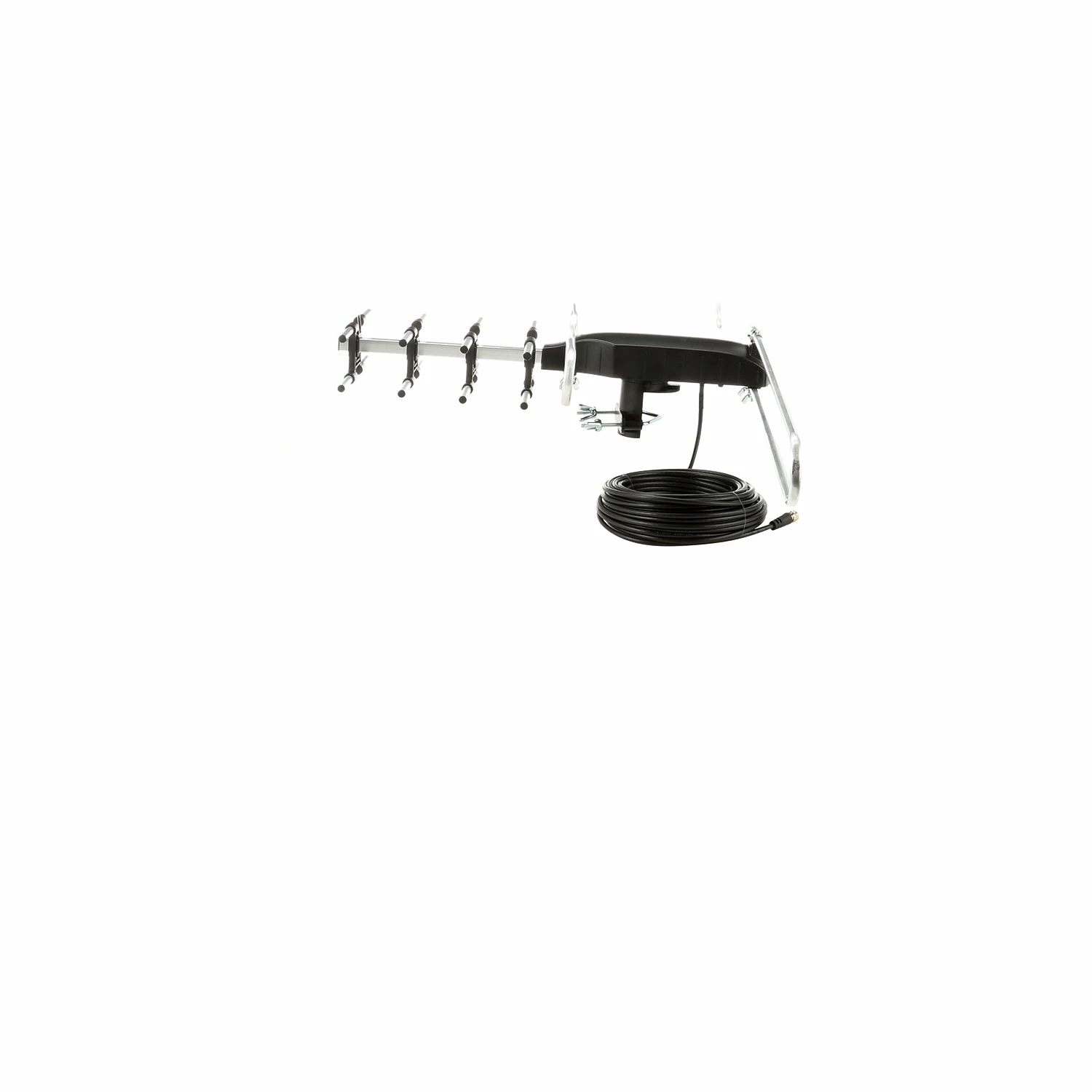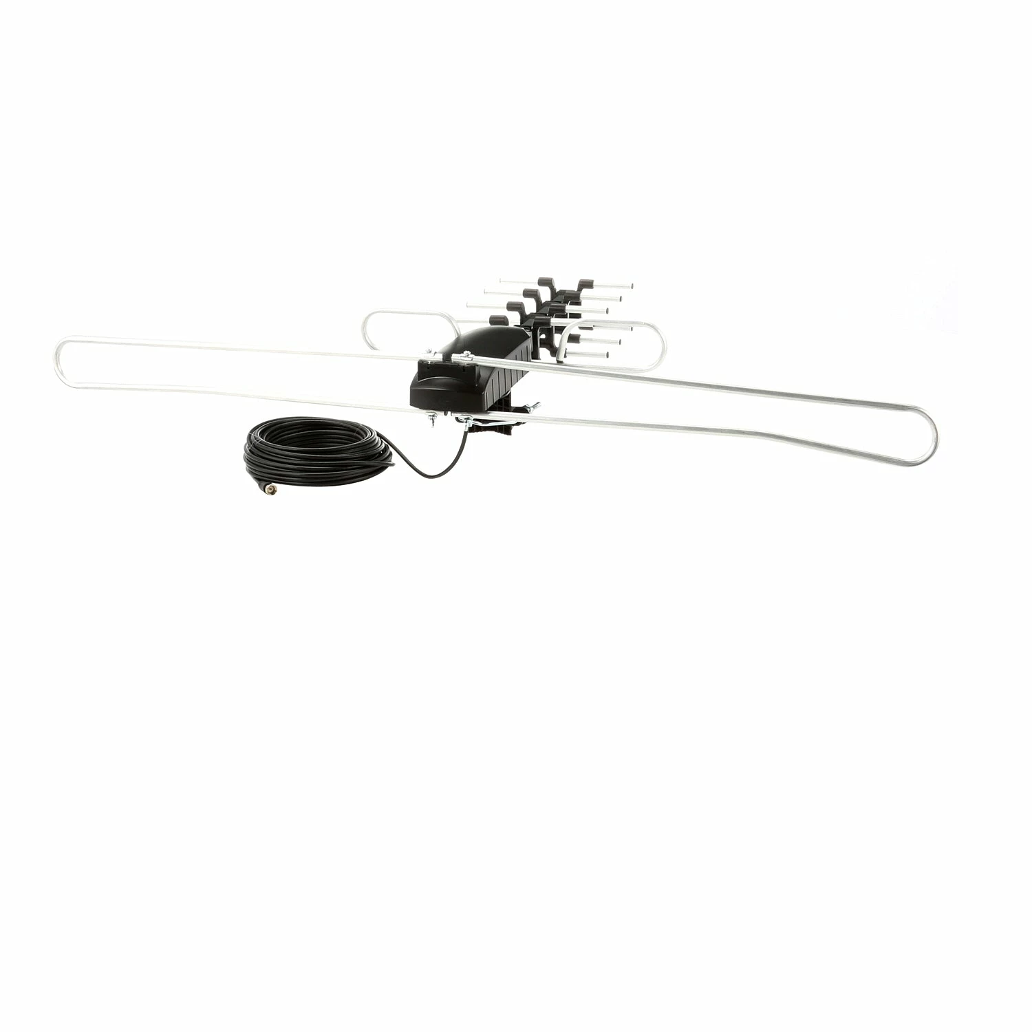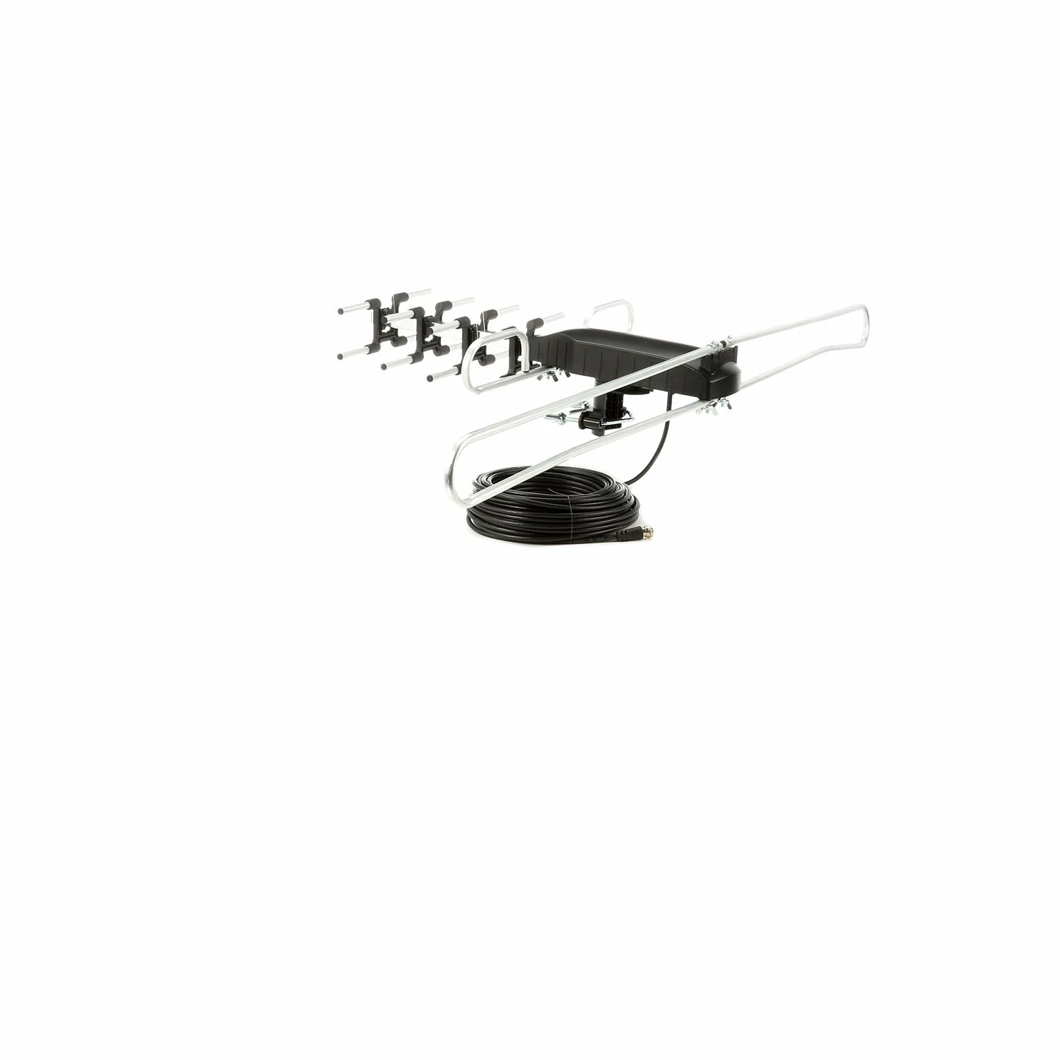 The Zenith 360ยฐ rotating outdoor passive antenna with Remote Control provides high gain with a wide band amplifier that boosts signal strength for increased picture and sound quality.ย Receives UHF, VHF and FM HD digital channels within a range of 120 miles and works with HD or analog TVs. The weather resistant anodized aluminum elements ensure durability and function in all different weather conditions. It is fully ready for use with digital TV and HDTV. This antenna is a full band DTV/VHF/UHF receiver. A wireless remote control allows for easy use, and the simple bracket makes installation hassle free. The installation kit includes a 50ft coaxial cable.