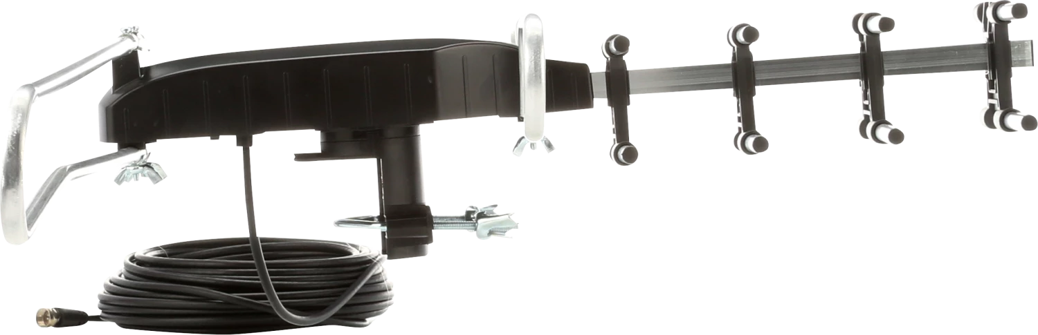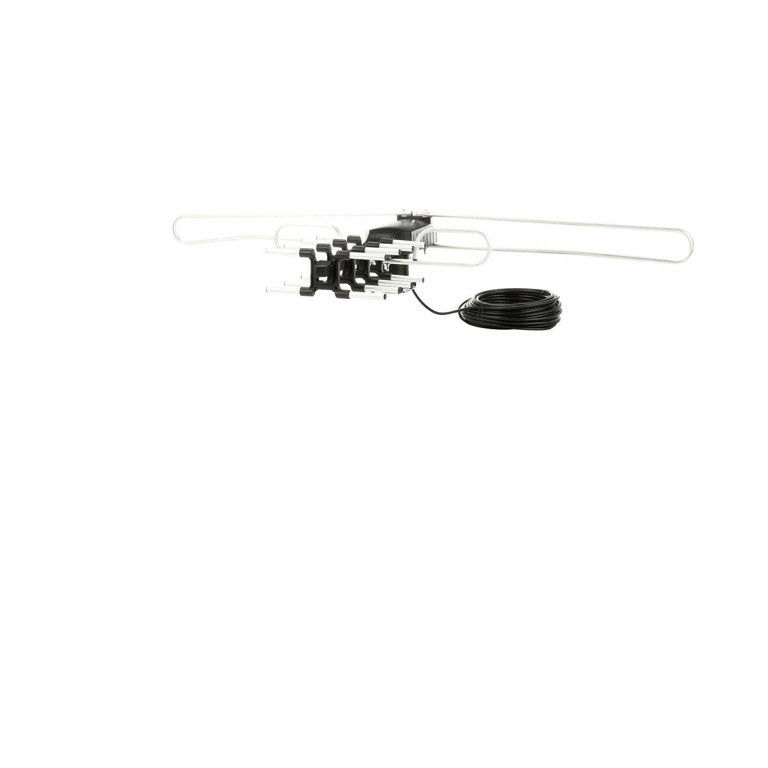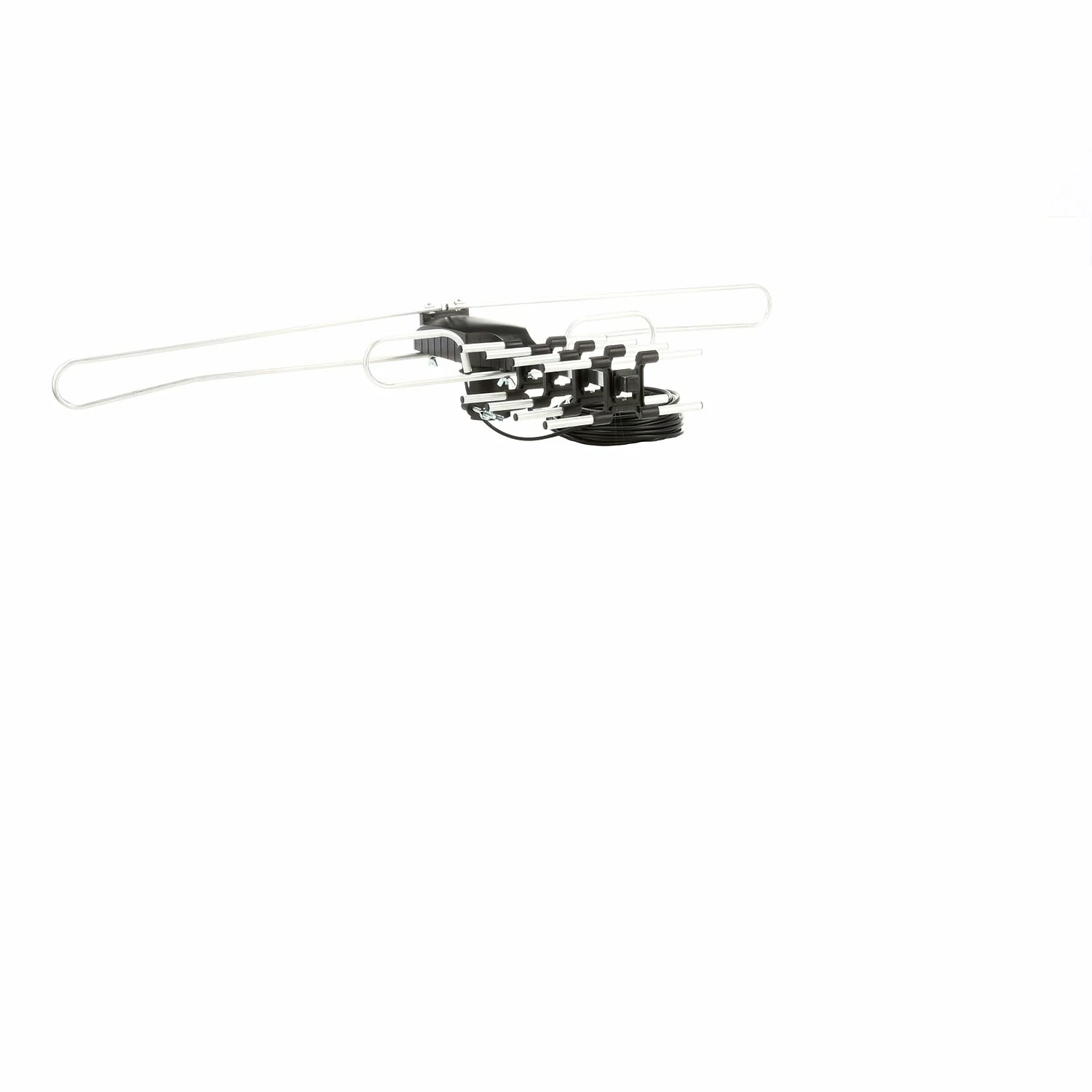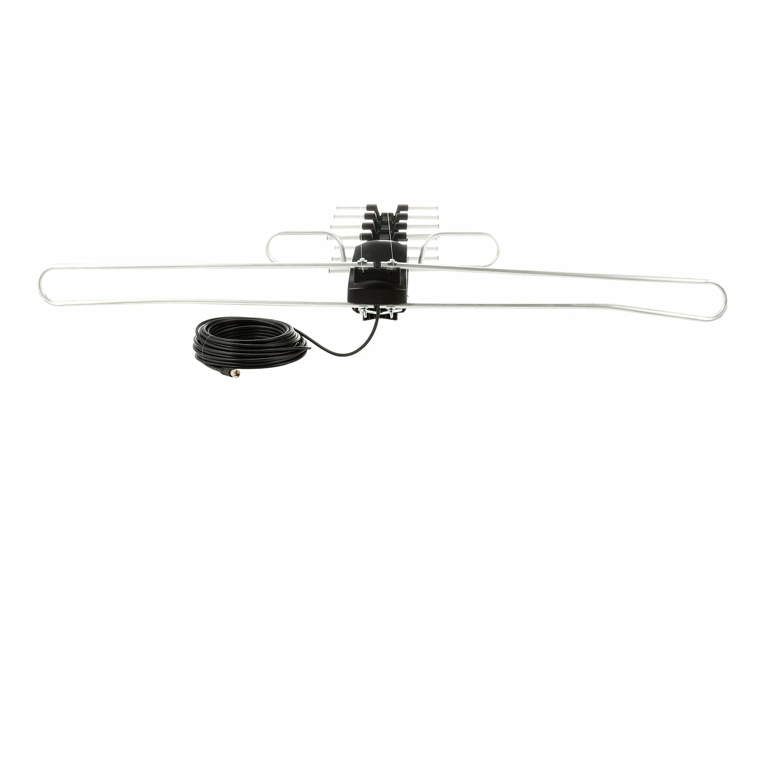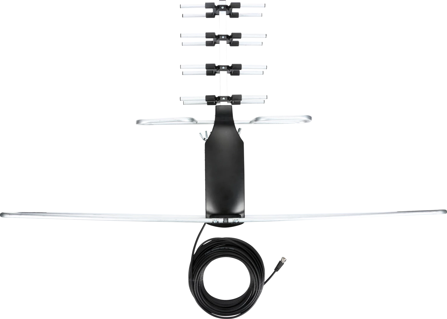 The Zenith 360ยฐ rotating outdoor passive antenna with Remote Control provides high gain with a wide band amplifier that boosts signal strength for increased picture and sound quality.ย Receives UHF, VHF and FM HD digital channels within a range of 120 miles and works with HD or analog TVs. The weather resistant anodized aluminum elements ensure durability and function in all different weather conditions. It is fully ready for use with digital TV and HDTV. This antenna is a full band DTV/VHF/UHF receiver. A wireless remote control allows for easy use, and the simple bracket makes installation hassle free. The installation kit includes a 50ft coaxial cable.