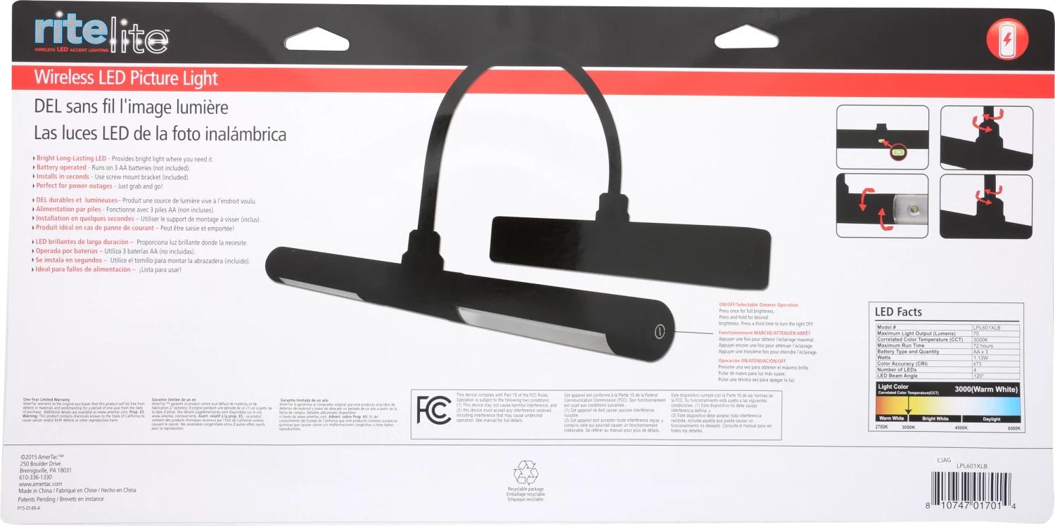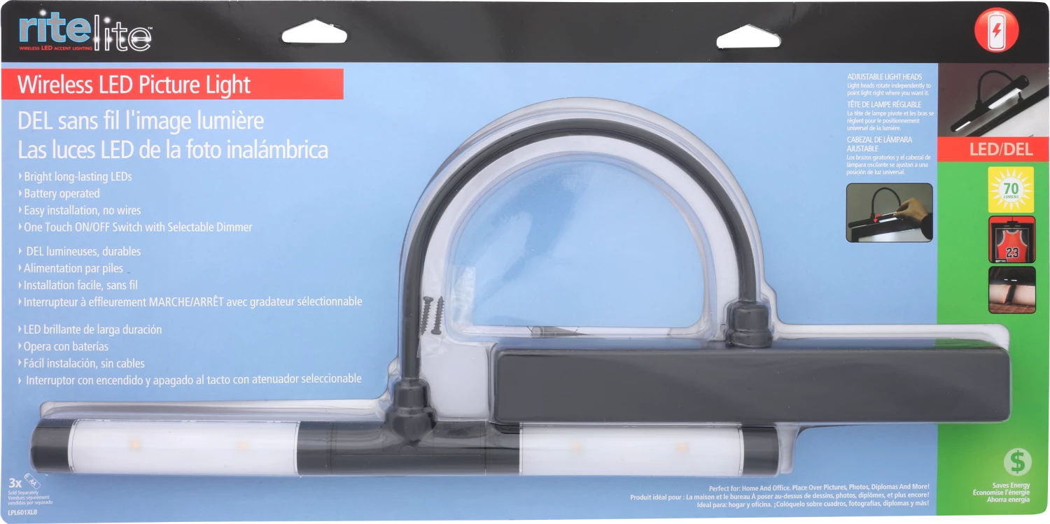 LED picture light illuminates paintings and pictures without ugly wires. With independent, rotating heads you can adjust the light ensuring perfect coverage. A built-in bubble level makes installation simple an perfect.