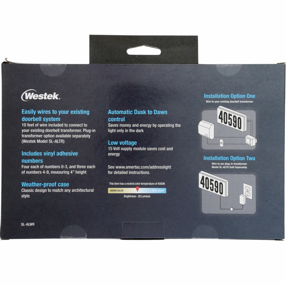 Westek’s attractive, illuminated address plaque provides 150 watts of light, up to a third more wattage than similar units. Easily customizable with the included vinyl numbers. Installs directly to existing doorbell transformer or with plug-in transformer (sold separately).