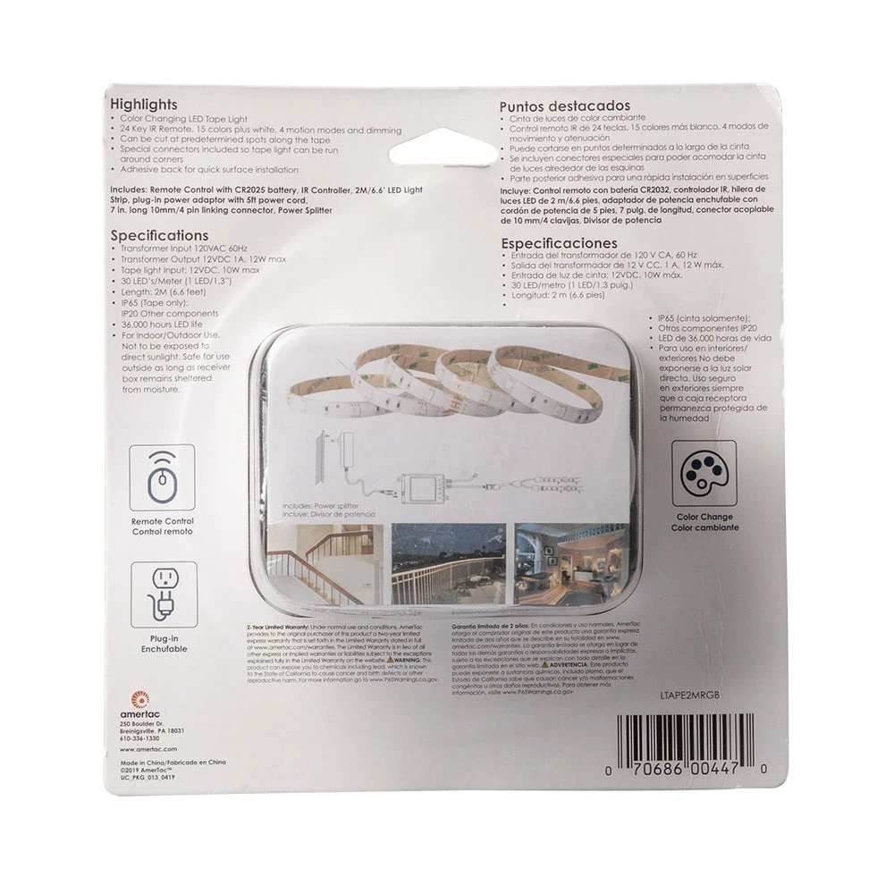 The Westek LTAPE2MRGB-T 6.6 FT LED Color Changing Tape Light with Remote transforms spaces like no other. Add creative color lighting to tray ceilings, coves, under cabinets, architectural elements and more. Choose from 16 colors with 4 settings for flashing and fading. You can also easily adjust the brightness and flashing speed via the IR remote. Features a power splitter where you can run cut tape in two directions from power source. Perfect for applications where power outlet is centrally located. 3M high-bond tape backing makes installation as easy as peel-and-stick. It can be cut at predetermined spots along the tape and it comes with a special connector so tape light can be linked or run around corners.