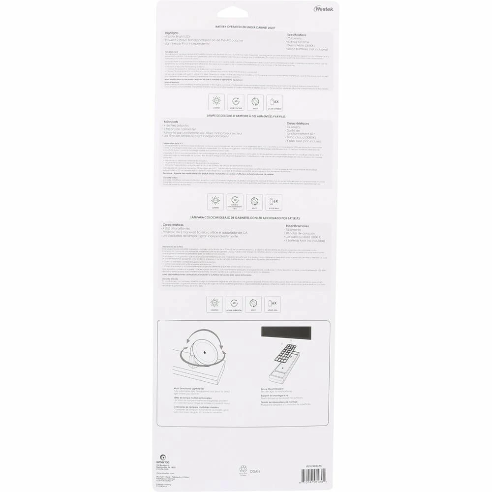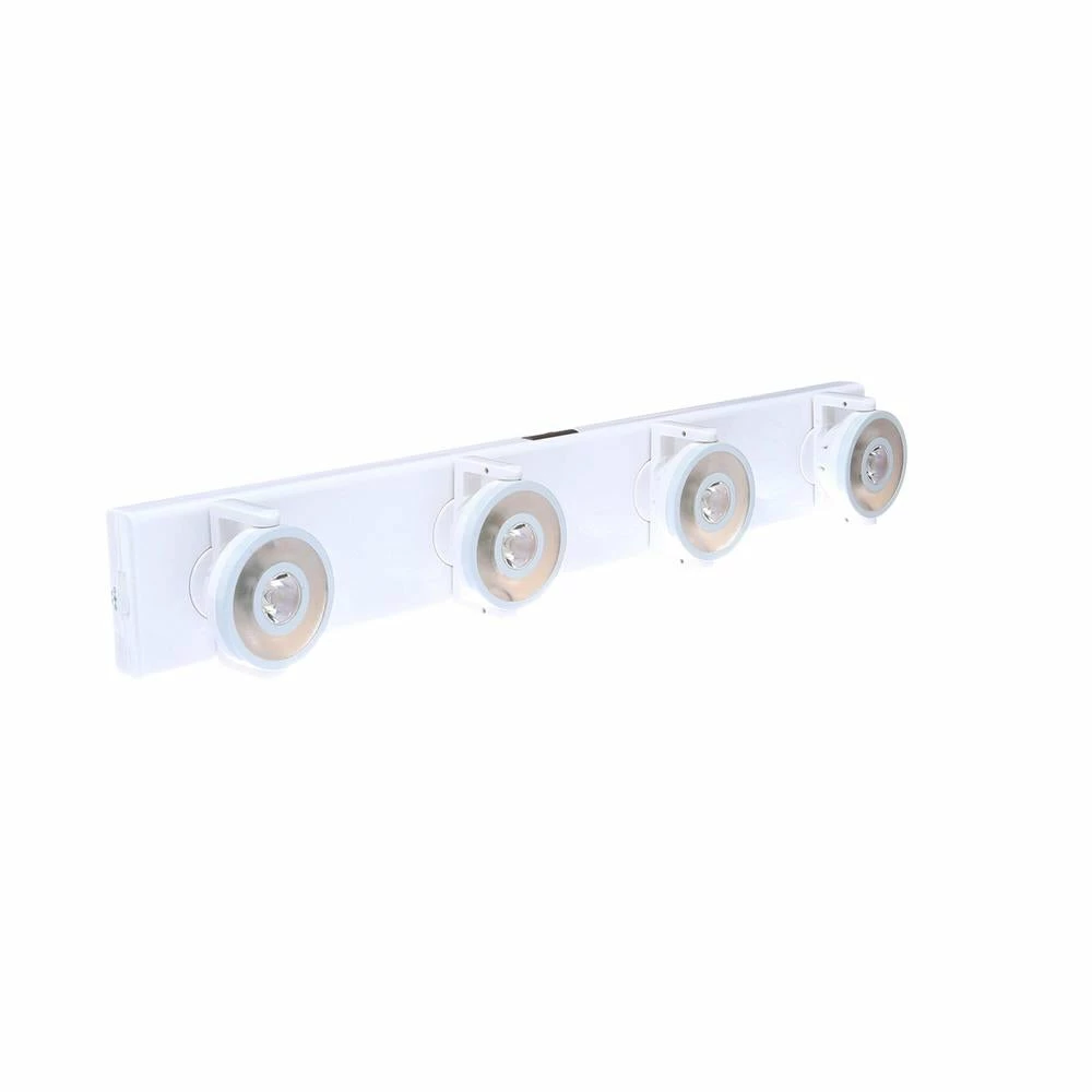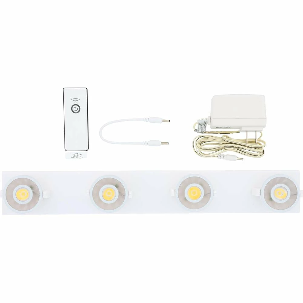 High output LED track light with remote. This unit features 4 independently adjustable heads for maximum flexibility. The clean lines and small profile look great in most applications. Included remote operates unit up to a distance of 20 feet. The LPL1074WRCAC is powered by either 6 AAA batteries or an included AC adapter.