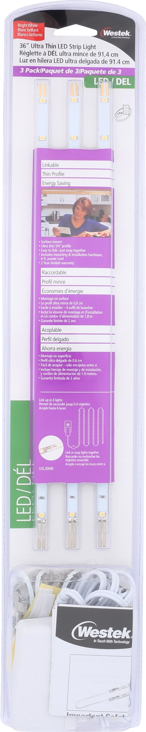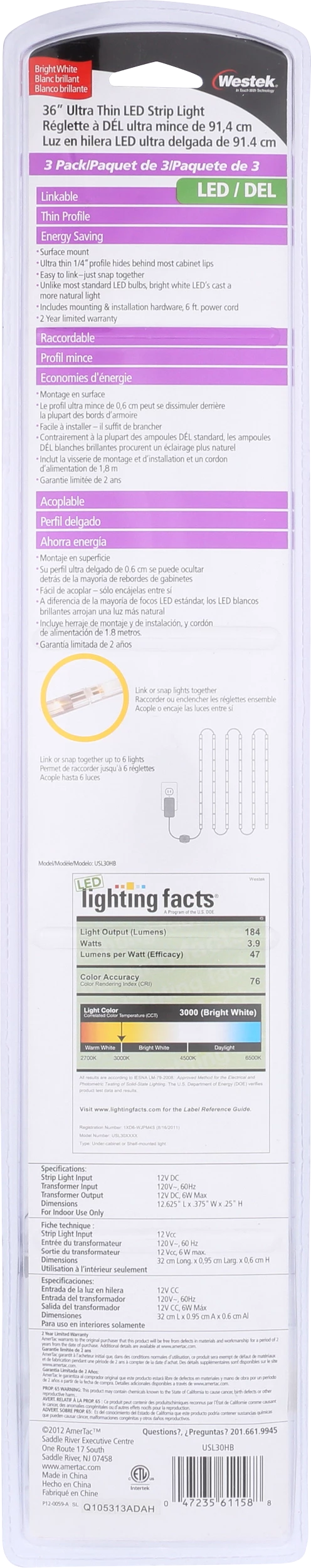 LED Ultra Thin Plug-In Strip USL30HBCC. The ideal solution for those who want energy efficient LED lighting in a thin, easy to install strip. Perfect for use under cabinets, above cabinets, in book cases and many more applications. The key to the performance is the super slim profile that hides in the most difficult places. Mounting is a snap with the included brackets that can be secured through double-sided tape or small screws. Everything needed to install the strips is included. Product Specifications and Details: Max Watts: 3.9W; Volts: 12V; Bulb Life: 8,000; Housing Material: PVC Plastic; Height by Width by Depth: 0.25-Inch by 0.38-Inch by 12.63-Inch.