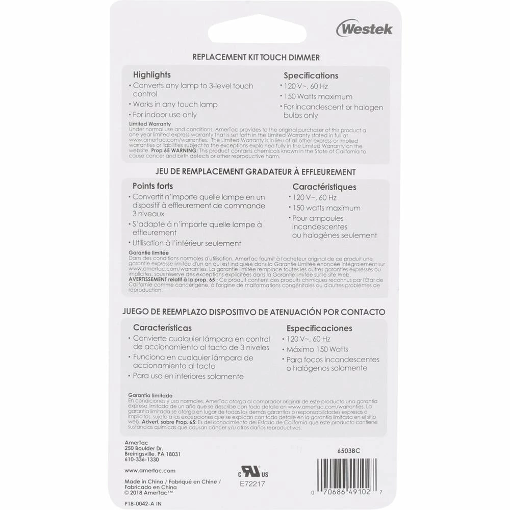 This indoor wire-in 3-level touch dimmer features a convenient, universal design that will replace and repair any touch dimmer. Installation is uncomplicated and easily performed and can be applied to any touch lamp.
