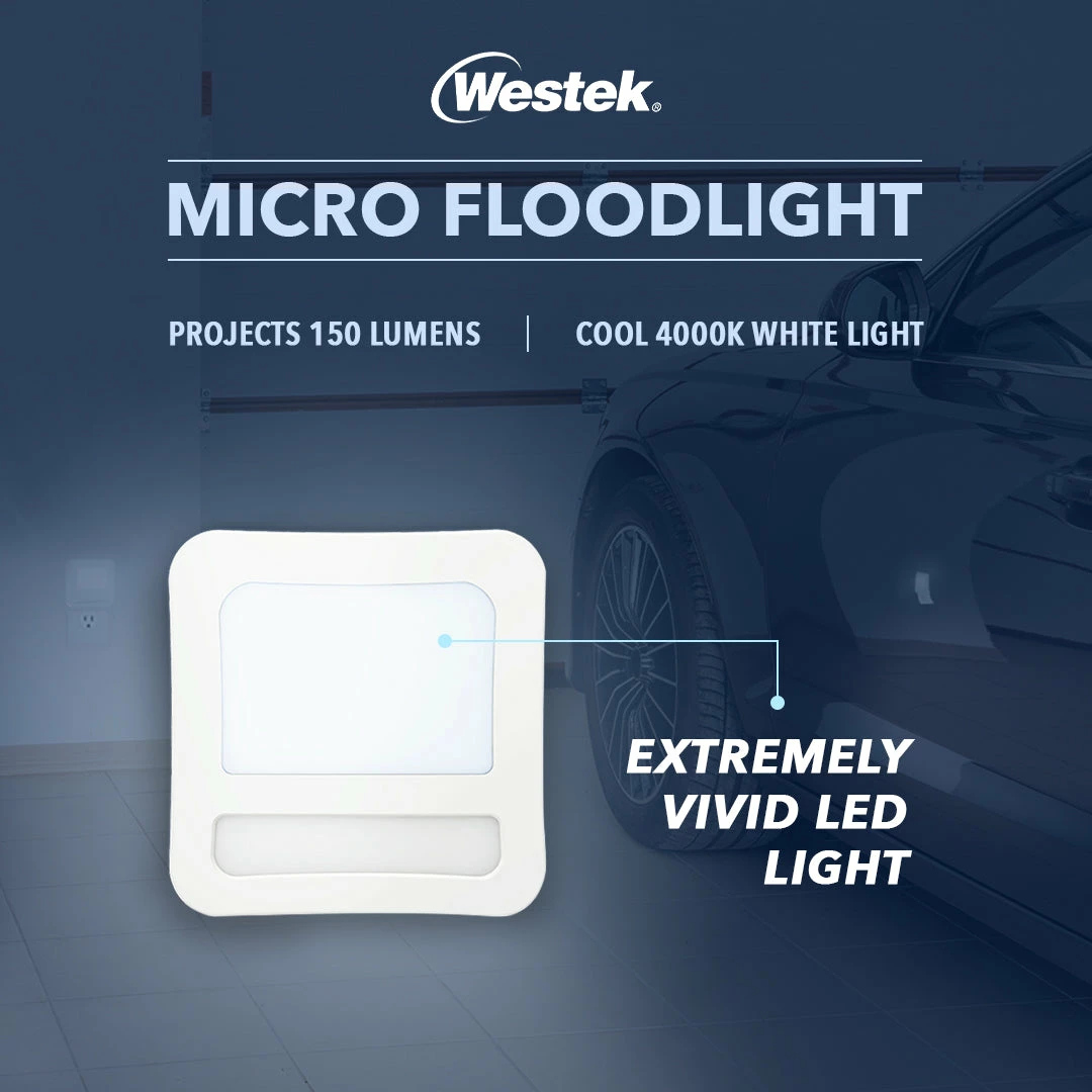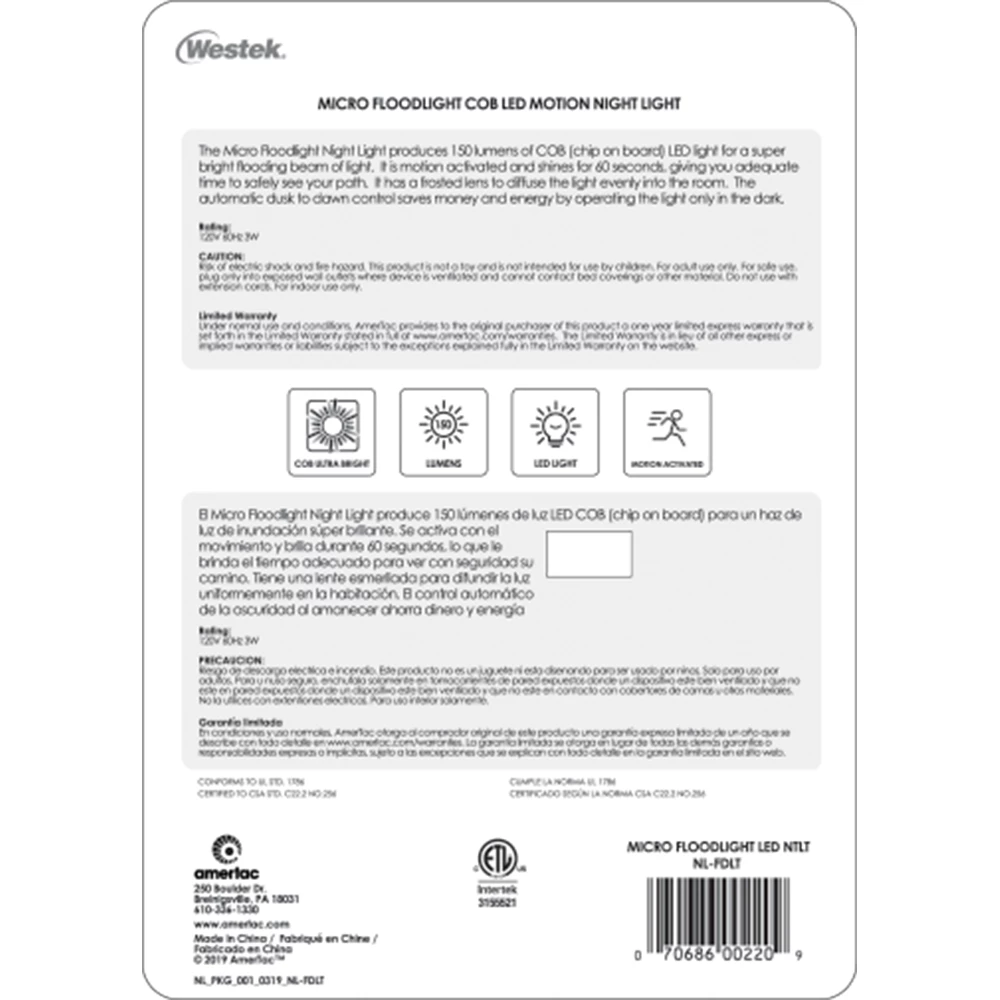 The Micro FloodlightΒ Night Light produces 150 lumens of COB (chip on board) LED light for a superΒ bright flooding beam of light. It is motion-activated and shines for 60 seconds, giving youΒ adequate time to safely see your path and is perfect for the garage or any room requiring high visibility in the dark.Β It has a frosted lens to diffuse the light evenly in the room.Β The automatic dusk to dawn control saves money and energy by operating the light only in the dark.