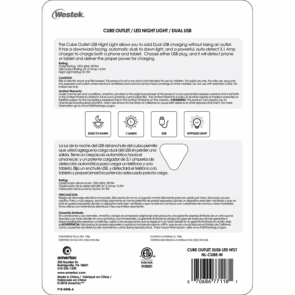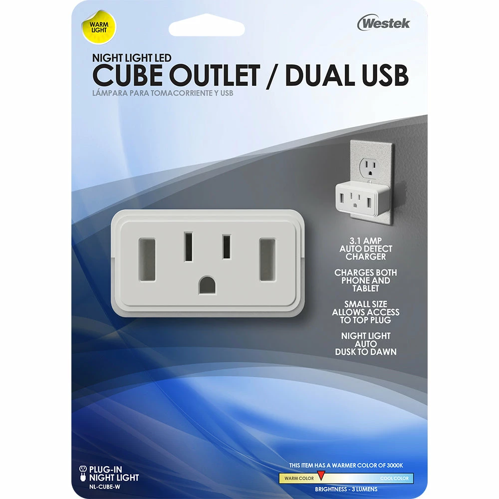 The Cube Outlet USB Night Light allows you to add Dual USB charging without losing an outlet. It has a downward-facing, automatic dusk to dawn light and a powerful, auto-detect 3.1 Amp charger to charge both a phone and tablet. Choose either USB plug and it will detect phone or tablet and deliver the proper power for charging.