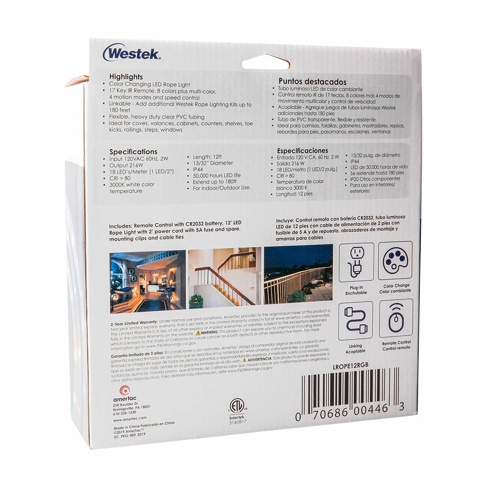 The Westek LROPE12RGB Indoor/Outdoor 12′ LED Color Changing Rope Light with Remote transforms spaces like no other. Add creative color lighting to tray ceilings, coves, under cabinets, architectural elements and more. 17 Key IR Remote. Choose from 8 colors including mult-color mode, 4 settings for flashing and fading. Rope Lights feature flexible, heavy duty, UV inhibiting PVC tubing that resists yellowing and cracking. The energy efficient LED rope lights use about 80% less energy than their incandescent cousins. Connect additional kits for up to 180 feet of continuous light. Perfect for inside homes to line steps, bottom or top of cabinets, valances, sliding doors, windows or entertainment center. Commonly used outdoors to outline decks, patios, pathways, stairs.