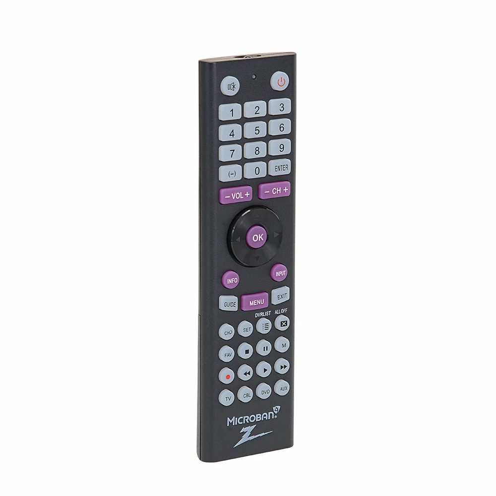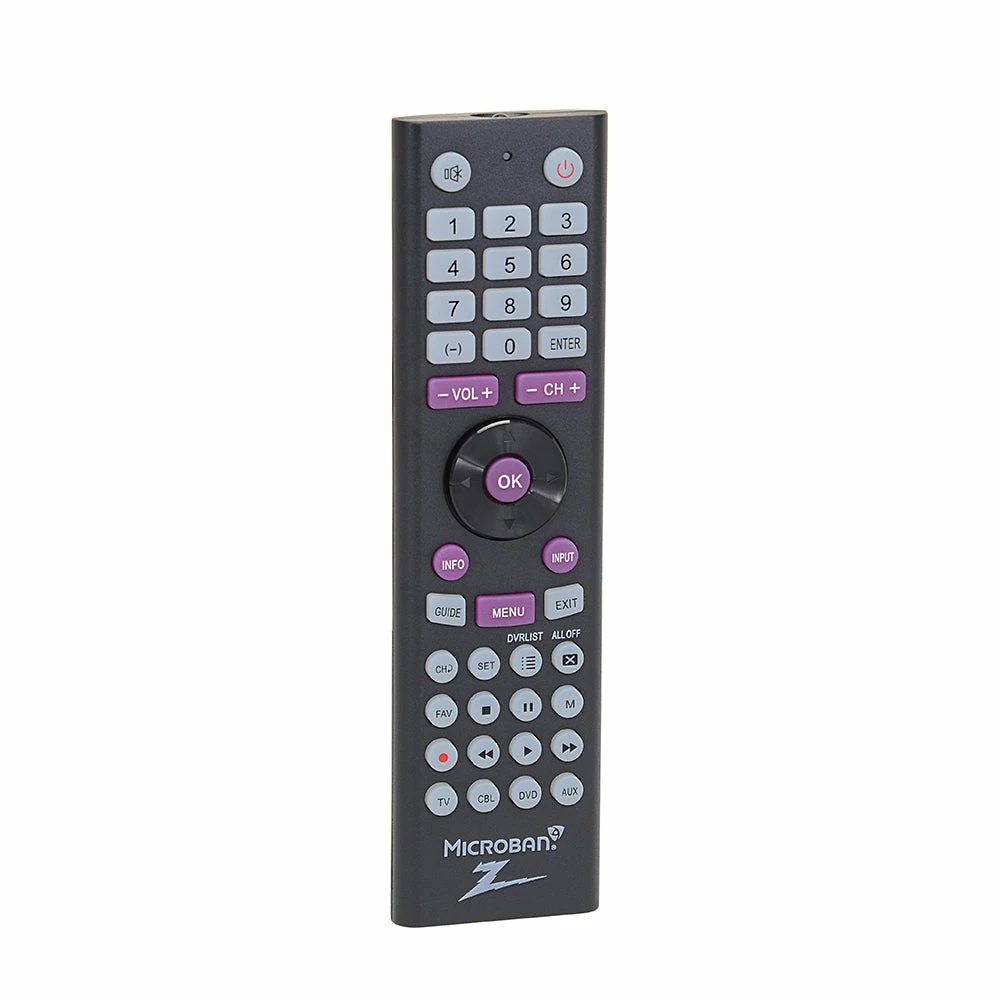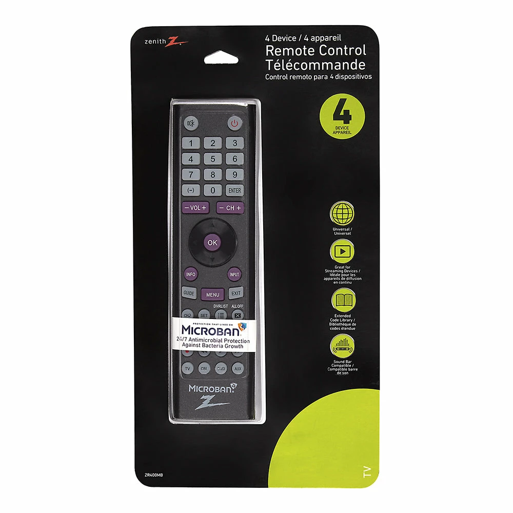 The Zenith 4-Device Universal Remote Control allows you to control 4 devices with just one remote. You can conveniently control TV, DVD/VCR and cable/satelite and Auxilliary devices all in one. Includes MICROBAN – 24/7 Antimicrobial Protection Against Bacteria Growth. This simple remote is guaranteed to work with all television brands to ensure an easy and quality viewing experience.