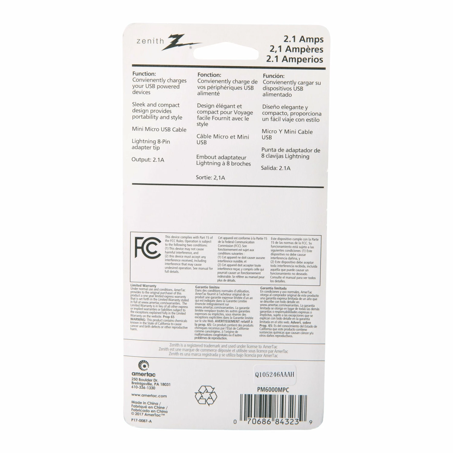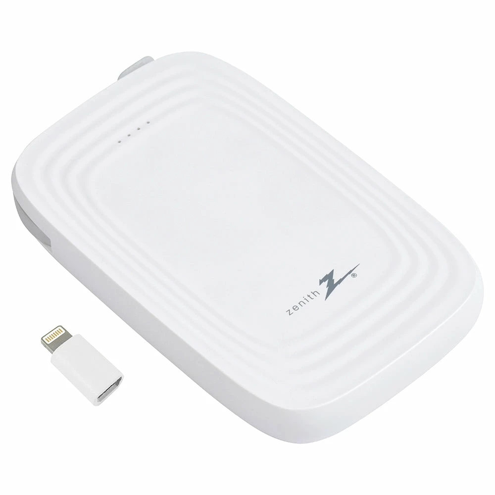 The Zenith Portable Charger conveniently charges any USB device such as a mobile phone, camera, MP3 player or tablet and includes a Lightning 8-Pin adapter for charging iPods, iPhones and iPads. It’s sleek and compact construction provides portability and style while charging on the go and the inner intelligent chip protects devices from overcharging. The energy saving design automatically shuts the charger off after 30 seconds in standby mode and the blue LED indicator helps monitor the remaining battery life.