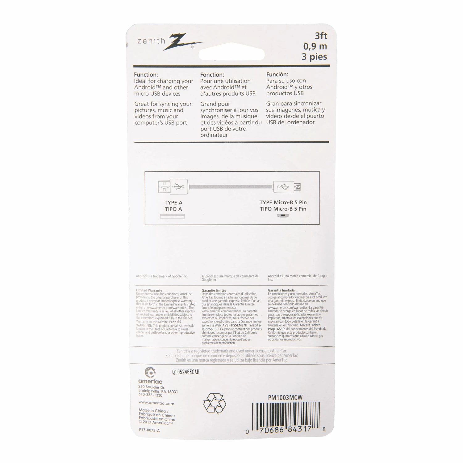 The Zenith Micro-B Cable is ideal for charging a Micro-B device or syncing pictures, music and videos from your computer’s USB port. This cable features molded strain relief and aluminum connectors that supports high speed charging & fast data transmission.