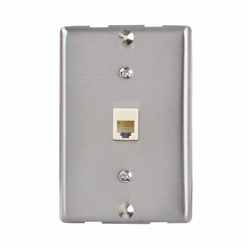 The Zenith Universal Wall Phone Jack with Silver finish is for surface mounting to a standard outlet box. The silver trim adds an industrial and modern decor.