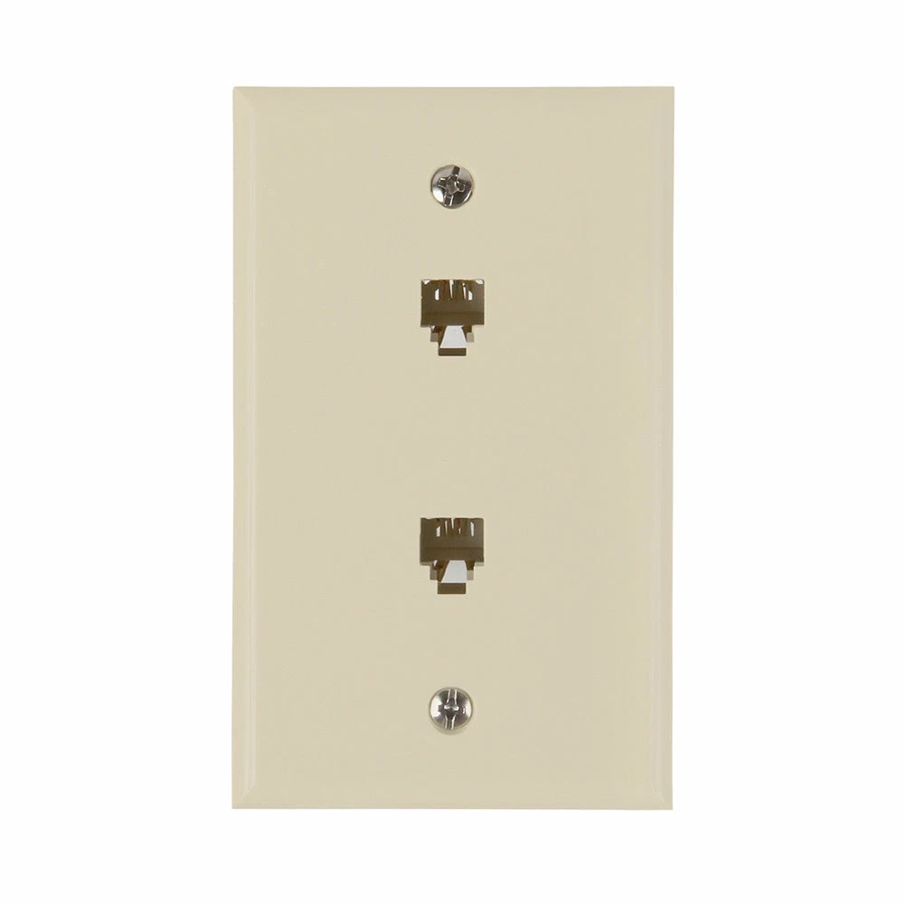 The Zenith Flush Mount Dual Telephone Wallplate with Almond finish allows flush mounted connection of 2 phone lines through a wall.